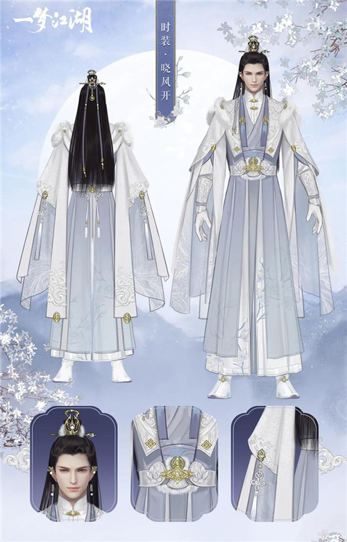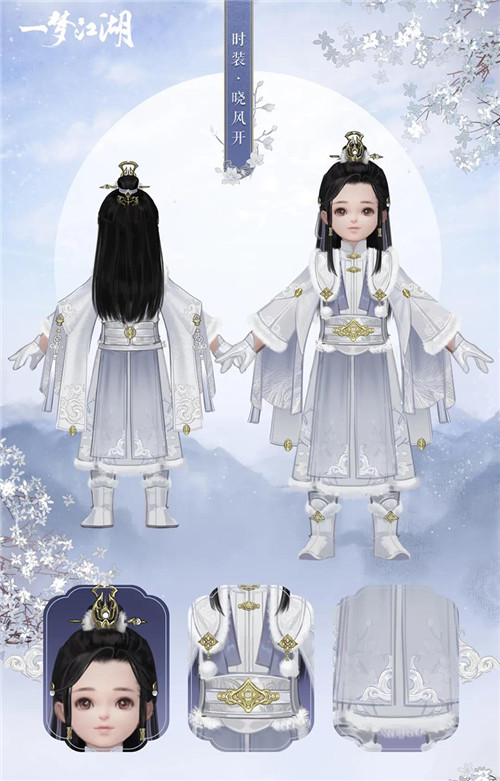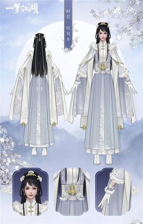 腰部挂件·掷玉梭灵感来源于织布梭,金色配饰与毛绒围边点缀其中,看雪云锦楼师傅精心设计出了这套时装·晓风开。梦江将会有新的江湖冒险等着我们,似位漫步雪景之中的翩翩贵公子 。在微霜轻雪中散发阵阵花香~